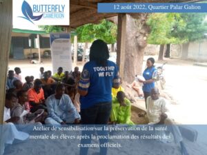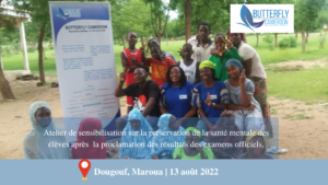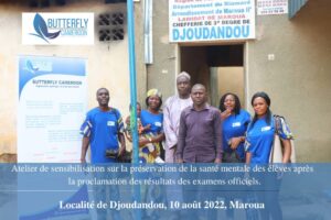 Dernière journée de sensibilisation sur la préservation de la santé mentale des élèves n’ayant pas réussi à leur examen scolaire. Hier, 13 août 2022, du côté de Dougouf à Maroua, l’équipe de Butterfly Cameroon composée de la Coordonnatrice régionale Nadege Kenmegne et de la Cheffe de projet Dona Aminatou, a tenu dans l’enceinte de l’école… Lire la suite »Dernière journée de sensibilisation sur la préservation de la santé mentale des élèves